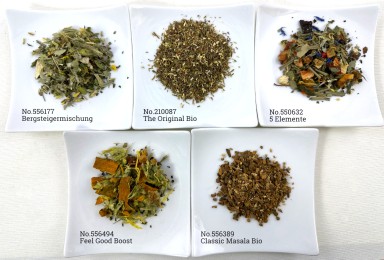 Fünf sehr unterschiedliche Kräuter- und Gewürztees, welche Euch einen Einblick verschaffen über die Bandbreite an Geschmäckern, die koffeinfreie Kräutertees zu bieten haben.
