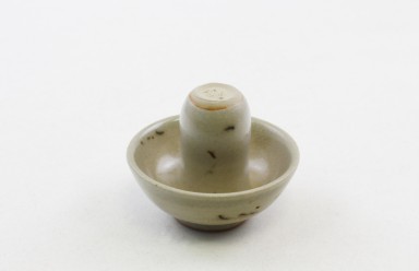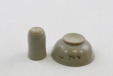 Teeschale & Riechtässchen im Set von Ninah Kim, glasiertes Steinzeug mit grün-braunen Flecken und orangefarbenen Kanten.