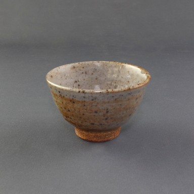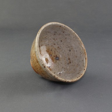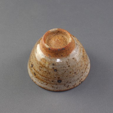 Diese Schale ist, bis auf den Fuß, komplett glasiert. Sie hat eine interessante Farbgebung mit dunklen, rotbraunen Sprenkeln, die sich unregelmäßig auf dem beigen Unterton verteilen.