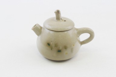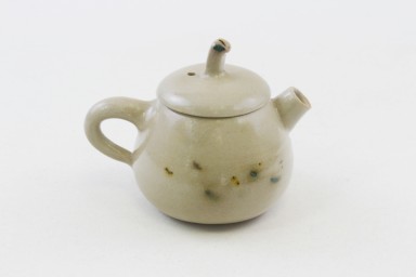 Steinzeug glasiert, mit braun-dunkelgrün-dunkelgelben Flecken und orangefarbenen Kanten, in Birnenform.