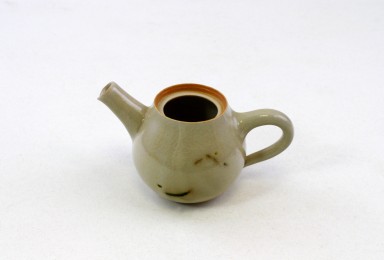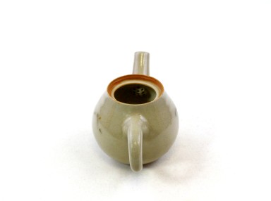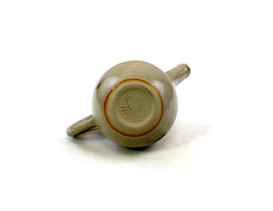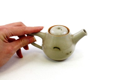 Glasiert hellem Stein mit dezent braun marmorierten Sprenkeln. Ein kleines, bauchförmiges Kännchen mit Deckel und filigraner Öffnung, das wunderbar glatt und geschmeidig in der Hand liegt.
