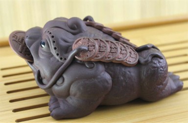 Dreibeinige Kröte aus Ton, mit beweglicher Münze im Maul. Chinesischen Legenden nach bringt sie Glück und Reichtum.