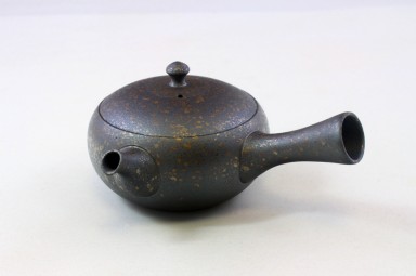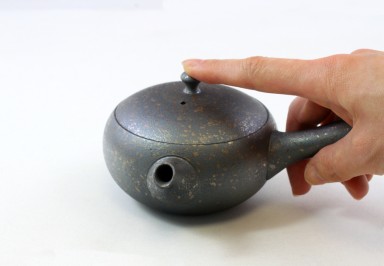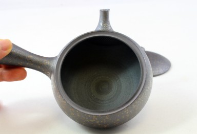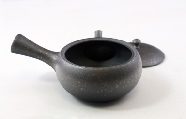 Handgearbeitet im Banko-Yaki, das bedeutet mit einem sehr eisenhaltigen Ton, mittelgrau mit silbrigen Flecken aus Tokoname. Diese Kyusu ist innen unglasiert, sollte also bitte nur mit klarem Wasser gereinigt werden.