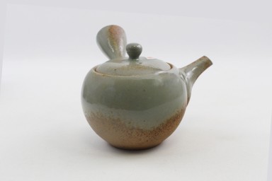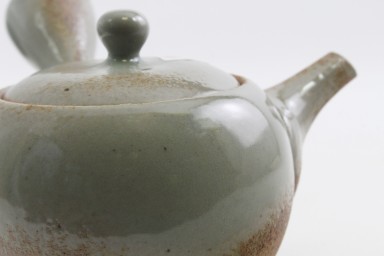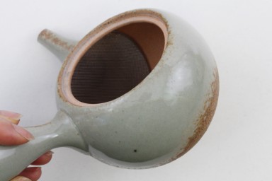 Diese blau-grau glasierte Kyusu besteht aus Keramik. Sie ist außen glasiert und innen unglasiert, sollte also bitte nur mit klarem Wasser gereinigt werden.