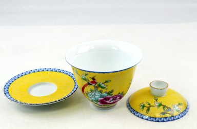 Gaiwan aus Porzellan, mit Vogeldekor.