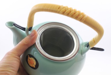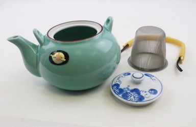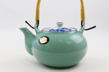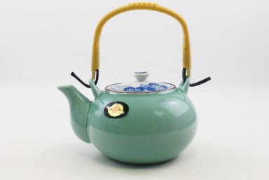 Hellgrüne Kanne mit blauen Blättern auf weißem Deckel.