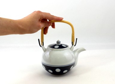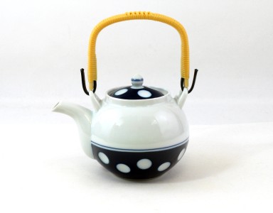 Weiße Kanne mit Polka-Dot-Muster.